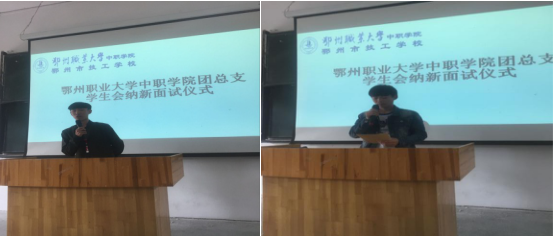 20171022日下午,鄂州职业大学中职学院团总支学生会纳新面试活动在106教室召开。此次面试由16级团总支学生会组织,邱莹、孙萌、秦雪、龚洲、谭玉堂等五位老师以及团总支书记周老师担任评委,目的是吸纳新生中的优秀人才加入团总支学生会帮助学生自我管理,同时也给新同学一个展示自我的平台。