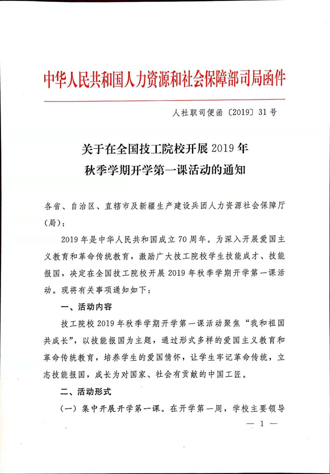 关于在全国技工院校开展2019年秋季学期开学第一课活动的通知