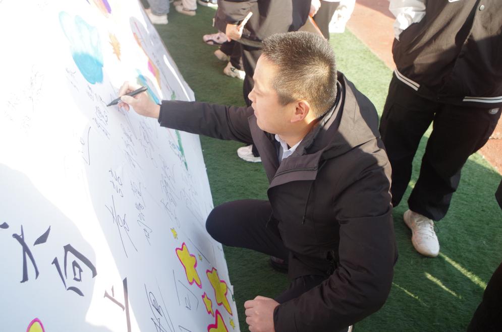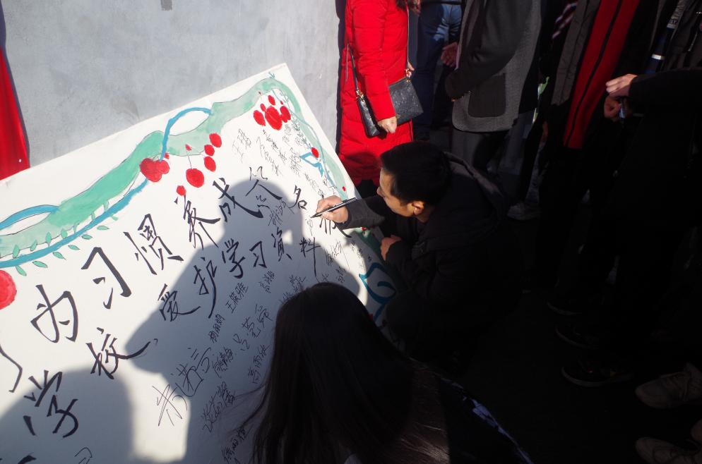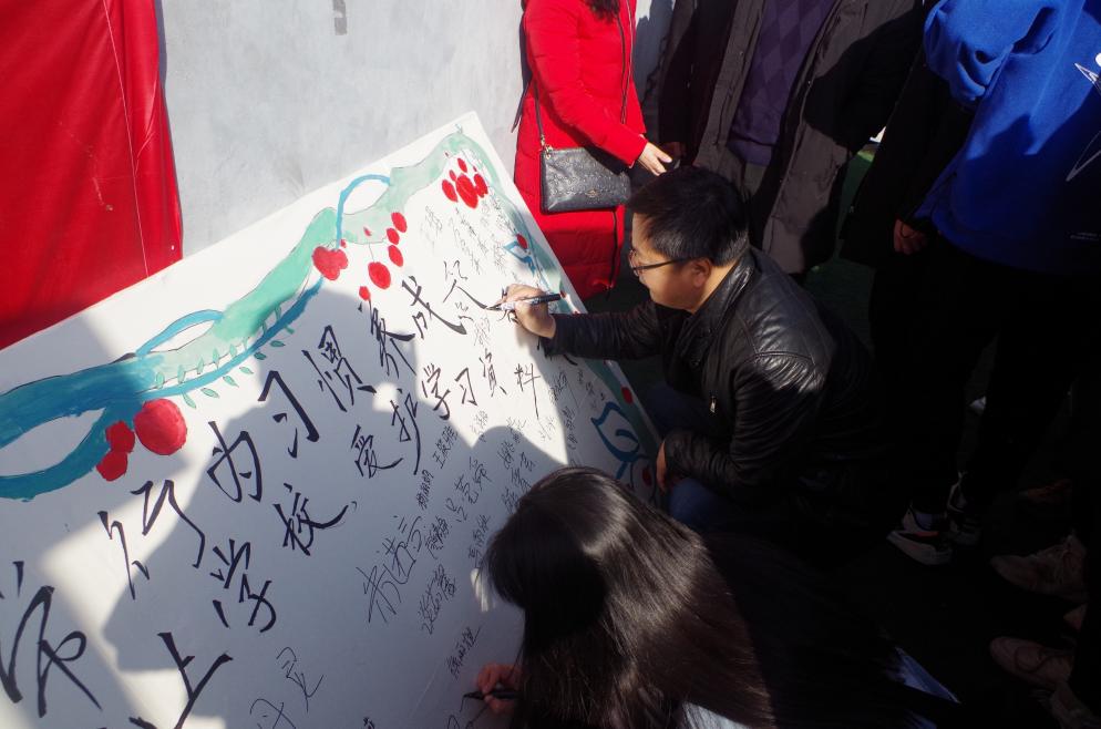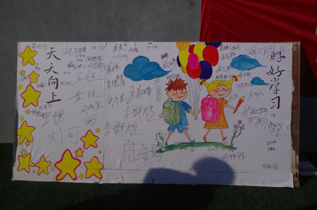 胡校长、毛主任、肖书记及学生代表倡议板报和横幅上签名
