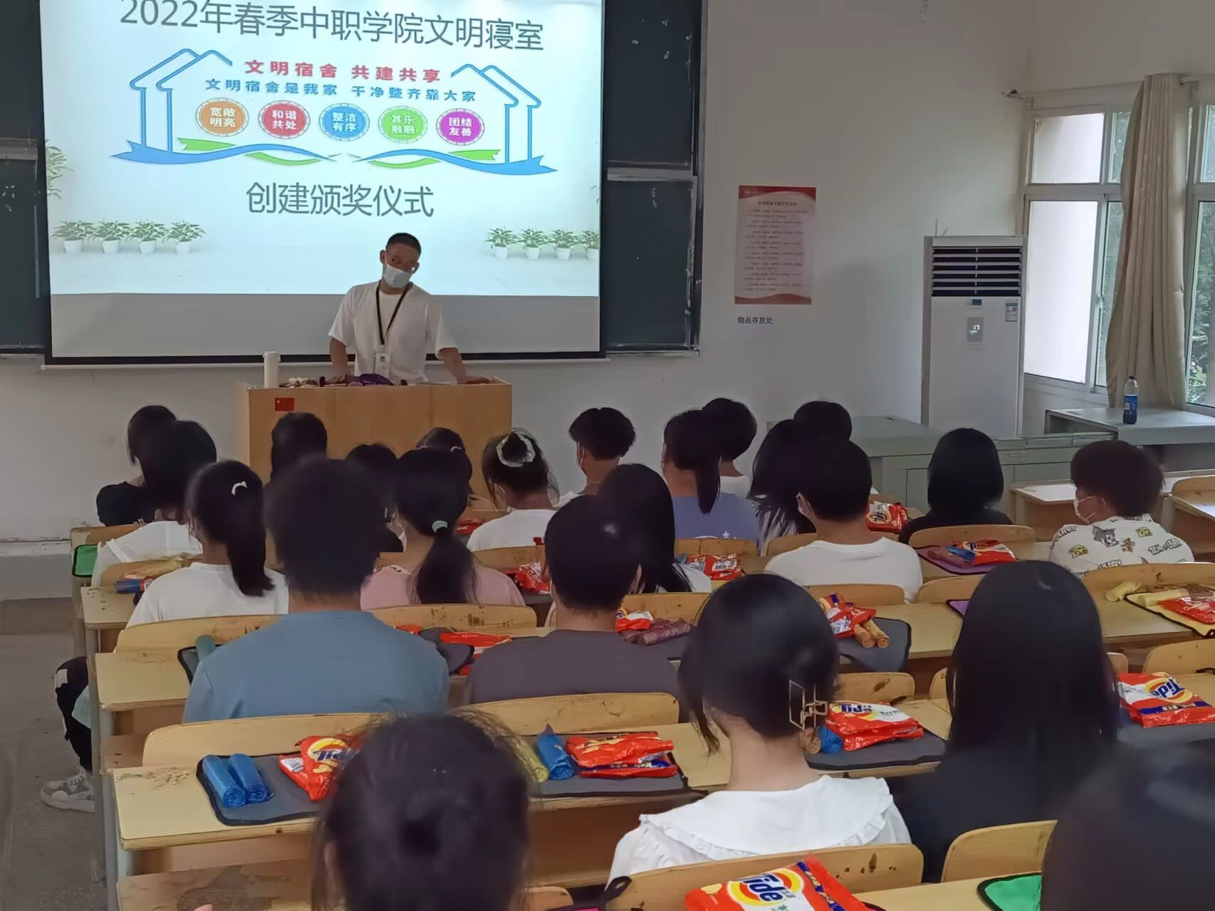 为构建和谐校园,养成良好的文明卫生习惯以及优良的宿舍学习风气。鄂州职业大学中职学院于2022年6月6日下午16时在1号教学楼106教室举行了“2022年春季中职学院文明寝室创建颁奖仪式”,出席本次颁奖仪式的领导有学生支部书记周芳书记、丁燕东老师、王修月老师和40名获得‘文明寝室’称号的寝室长。