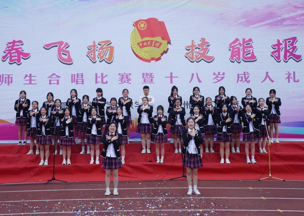 接着15个班级的学生们身穿统一服装,用嘹亮的歌声、饱满的情感,将《我的中国心》、《歌唱祖国》、《夜空中最亮的星》、《New Boy》、《同桌的你》、《光荣啊,中国共青团》、《十年》、《老男孩》和《我相信》等一首首脍炙人口、催人奋进的经典旋律唱响校园,展现了学子们蓬勃向上的精神风貌和拳拳的爱国之心,赢得在场观众的阵阵掌声。