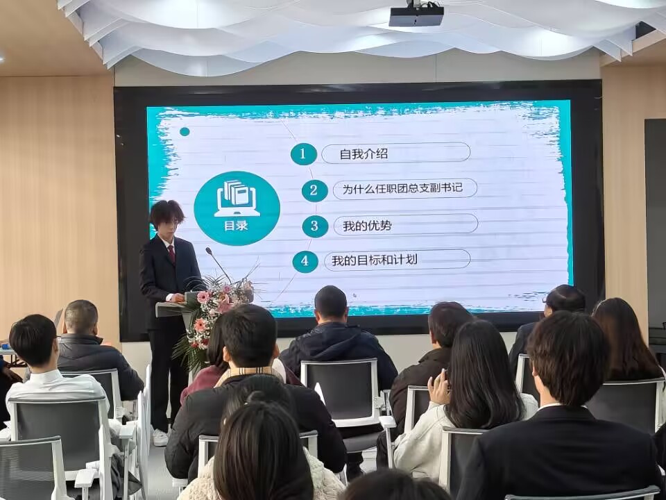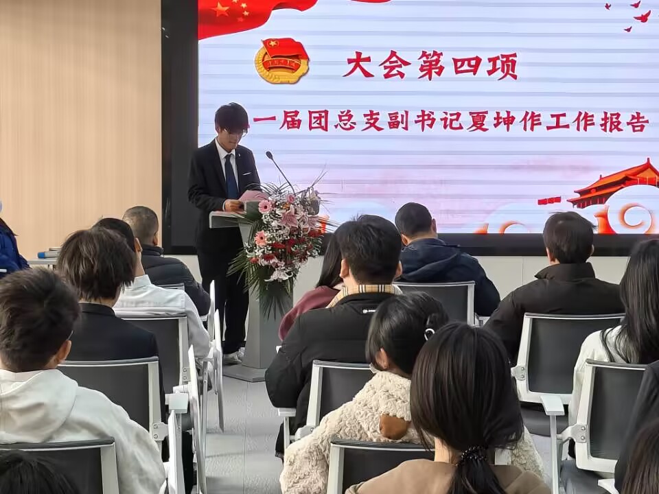 再由上一任团总支副书记21级电商班的夏坤做代表团总支作述职报告,希望新一届团总支成员能够“在其位,谋其政,担其责”,并通过携手合作,把团总支越做越好。