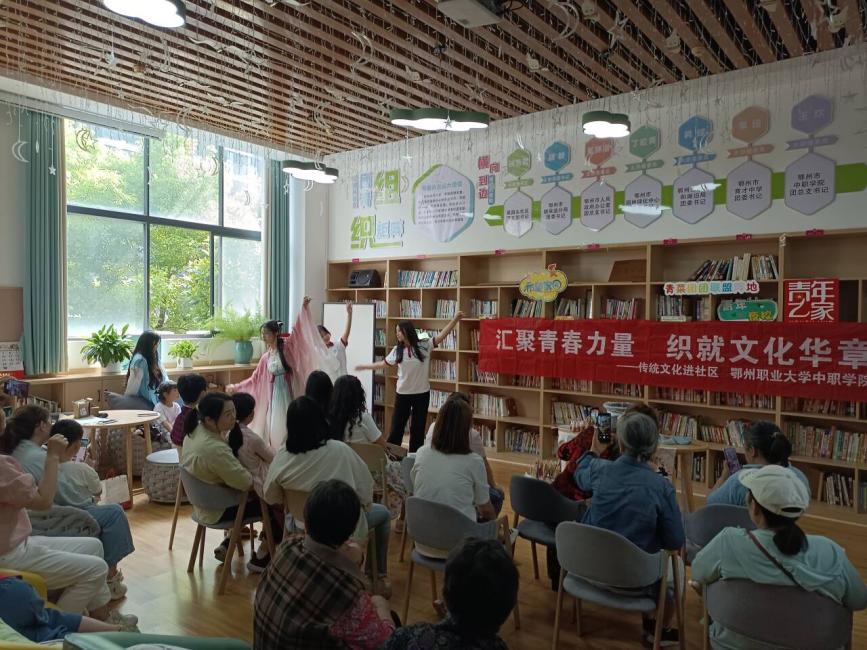 活动伊始,鄂州职业大学中职学院的学生们身着汉服,以一支轻盈婉约的古典舞《夏韵》拉开序幕。水袖翩跹、折扇轻摇,舞者们用柔美的身姿演绎立夏时节万物生长的灵动,引得现场掌声阵阵。“没想到传统舞蹈和节气文化结合得这么美!”社区居民王阿姨举起手机记录精彩瞬间,连连赞叹。
