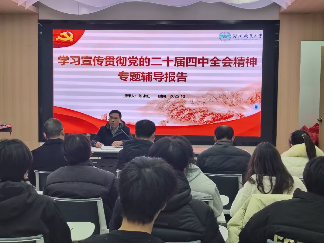 2025年12月22日,校党委委员、副校长陈永红在双创学院会议室作了“学习宣传贯彻党的二十届四中全会精神”专题辅导报告,推动全会精神在基层落地生根。中职学院各党支部委员、党员教师代表参加学习。