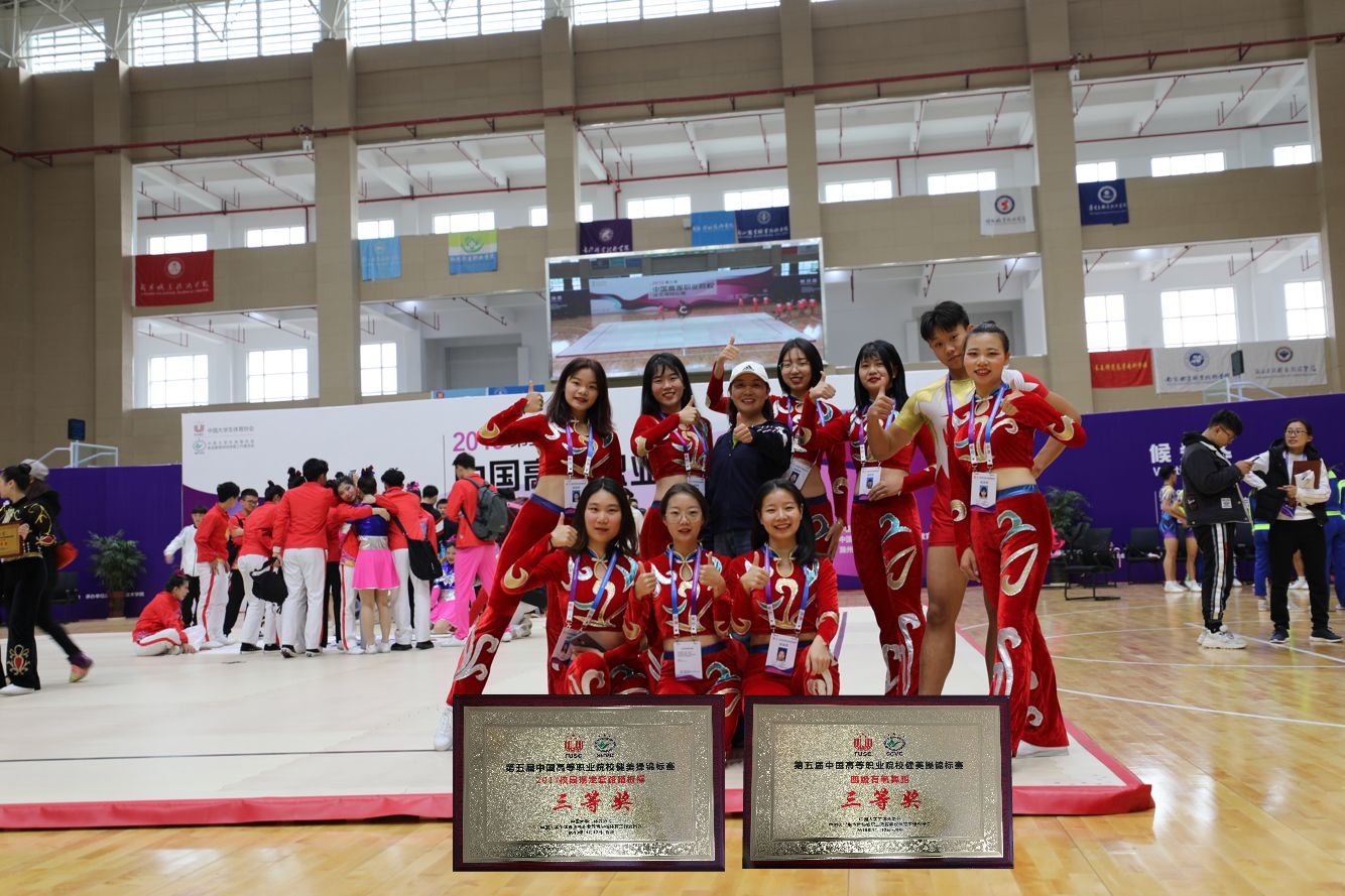 我校健身操舞代表队参加了四个项目的比赛,荣获了二个三等奖,其中张洪莲、朱银帆两名同学被中国大学生体育协会授予“优秀运动员”称号。
