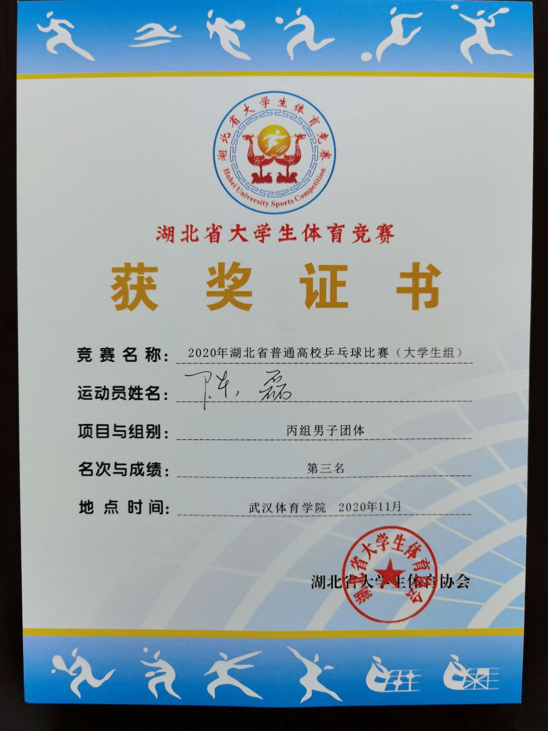 2020年湖北省高校乒乓球比赛于2020年11月13日至15日在武汉体育学院小球馆隆重举行,我校乒乓球代表队第一次报名参赛并创下团体第三名的好成绩。