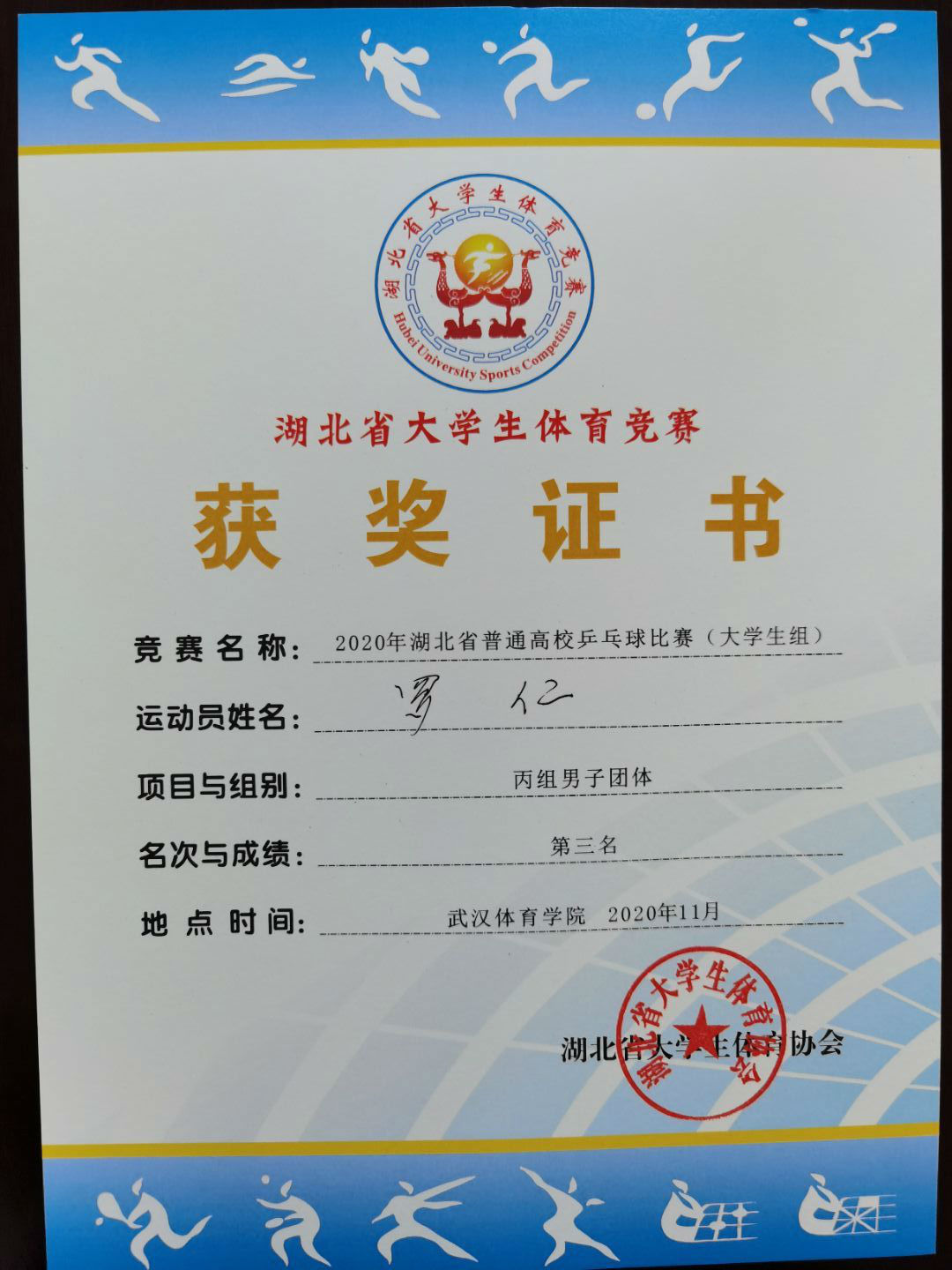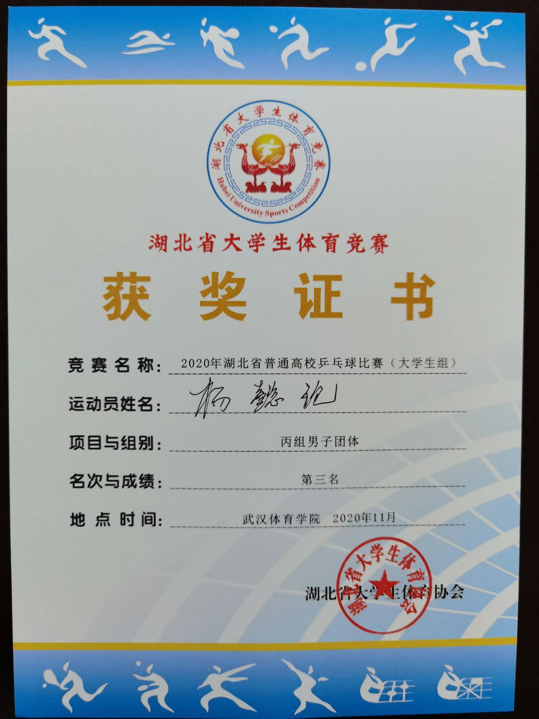 2020年湖北省高校乒乓球比赛于2020年11月13日至15日在武汉体育学院小球馆隆重举行,我校乒乓球代表队第一次报名参赛并创下团体第三名的好成绩。