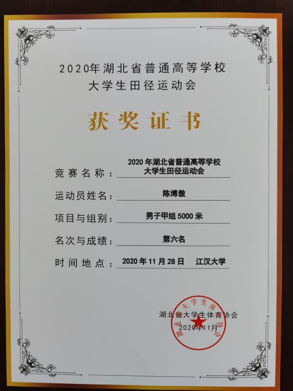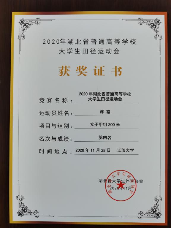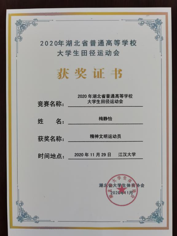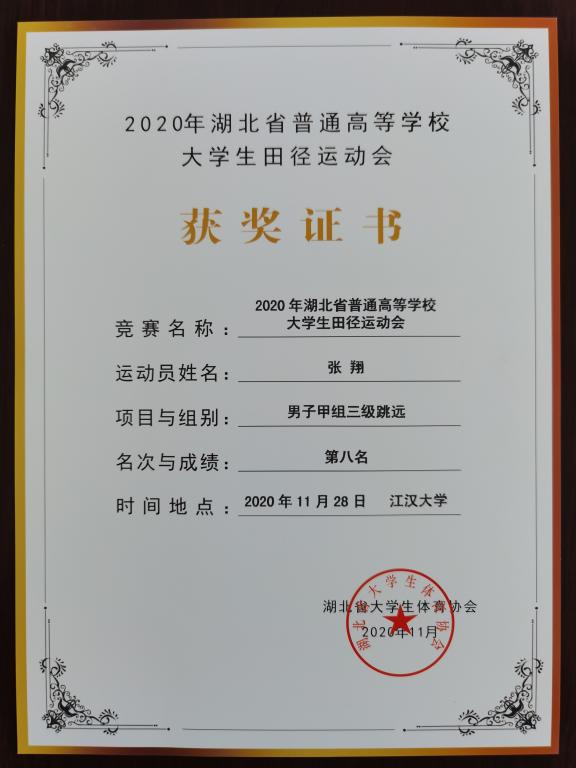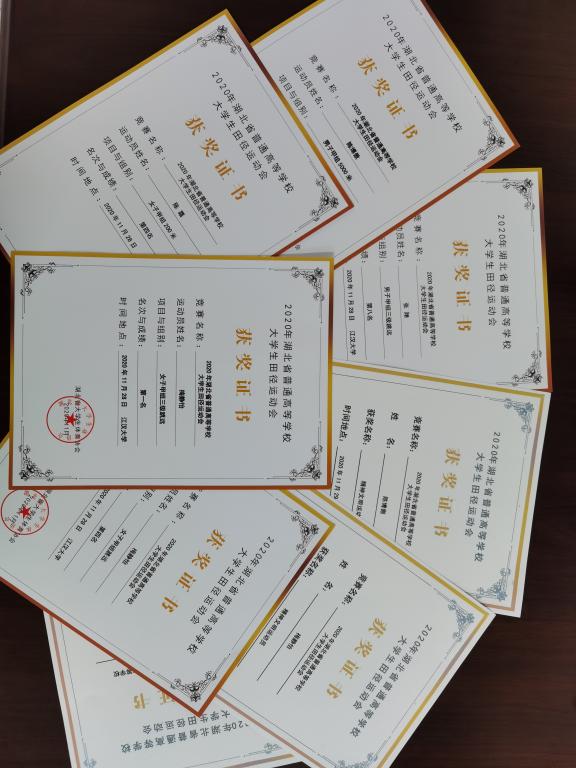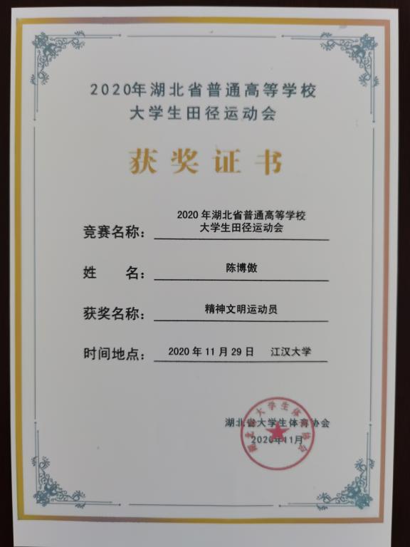 2020年11月28日—29日,湖北省普通高等学校大学生田径运动会在武汉江汉大学举行。来自全省40所普通高等学校50代表队共627名运动员参赛,经过两天的决战,我校10名运动员参加了甲组10个项目的比赛,运动员通过赛场上的齐心协力、奋勇拼搏下,斩获1金、2个第四、1第六和1第八名的好成绩其中2人荣获精神文明运动员称号。