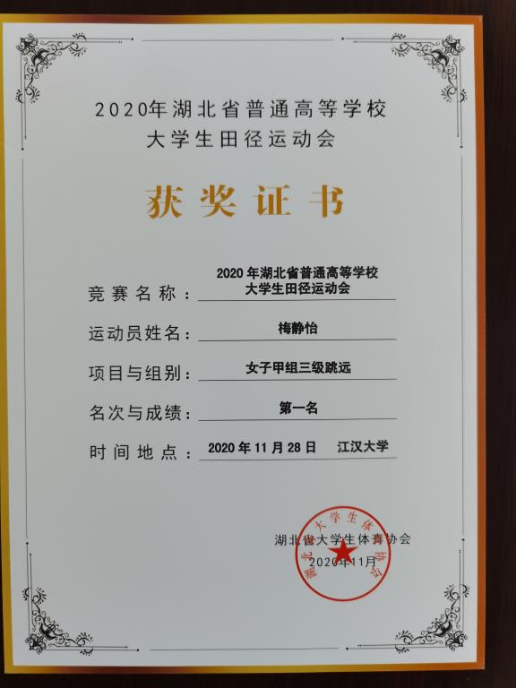 2020年11月28日—29日,湖北省普通高等学校大学生田径运动会在武汉江汉大学举行。来自全省40所普通高等学校50代表队共627名运动员参赛,经过两天的决战,我校10名运动员参加了甲组10个项目的比赛,运动员通过赛场上的齐心协力、奋勇拼搏下,斩获1金、2个第四、1第六和1第八名的好成绩其中2人荣获精神文明运动员称号。