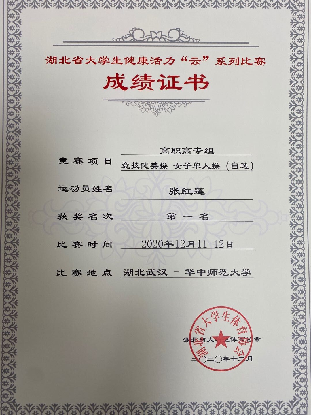 同时参加由湖北省大学生体育协会主办,华中师范大学、湖北大学承办湖北省健康活力“云”系列比赛,本次比赛分为以下四个组别:高水平组、体育学院组、普通院校组、高职高专组,比赛项目包含健美操、瑜伽、艺术体操、排舞等四项通过录制视频、线上评选竞赛方式进行。本次比赛38个学校出席51支代表队,共计1131参赛。我校健美操队参加高职高专组的全民健身操四级有氧舞蹈项目比赛,分别荣集体第一名、女子单人操第一名、男子单人操第二名的好成绩