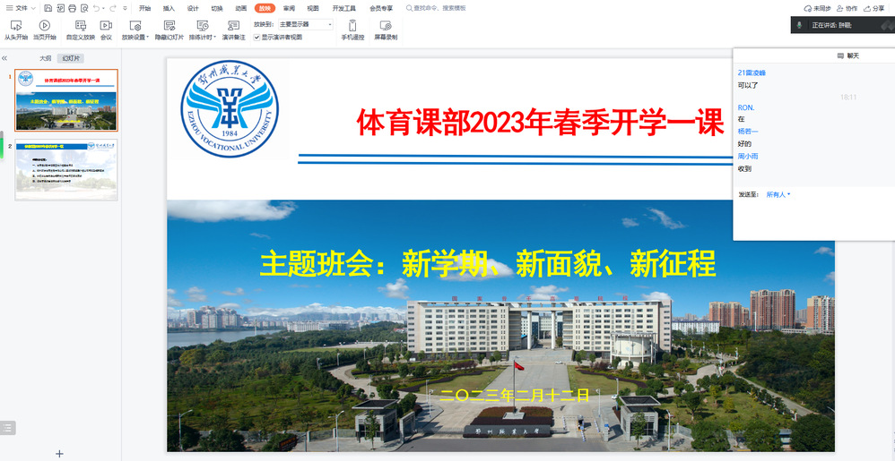 为进一步落实立德树人根本任务,引导学生更快地投入到新学期的学习生活中,2月12日晚6点30,体育课部2021级、2022级4个班级召开“开学第一课”主题班会,会议采取线上方式进行,由团总支书记余昊主持。