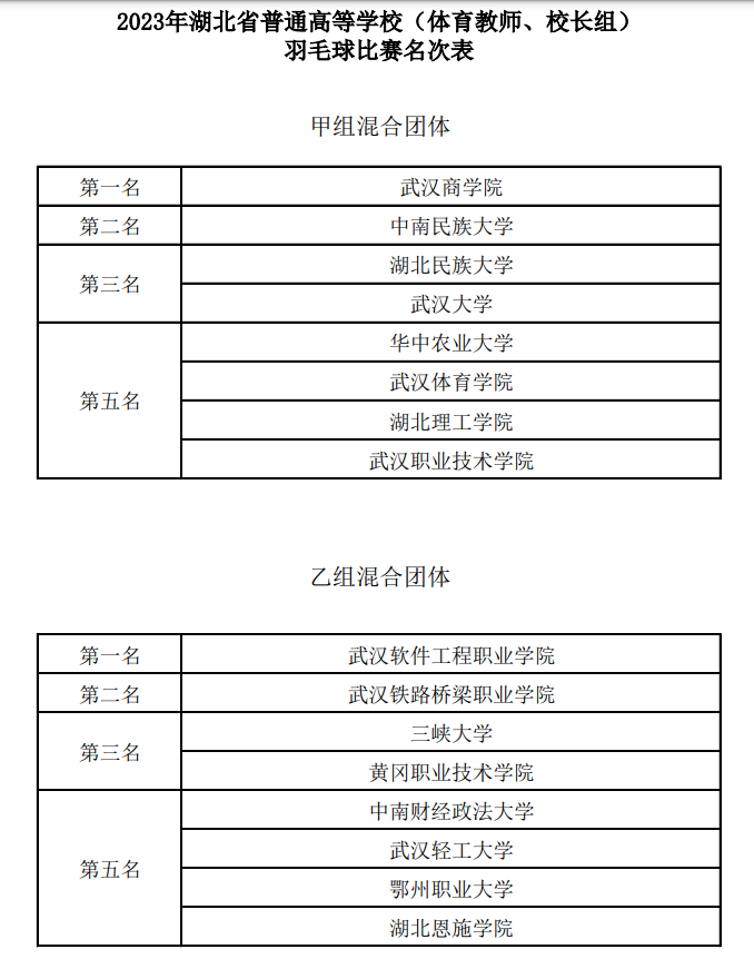 7月1日-2日,2023年湖北省普通高校体育教师和校长组羽毛球比赛在湖北恩施学院顺利完赛。比赛由湖北省大学生体育协会主办,湖北恩施学院和湖北省大学生羽毛球协会承办。