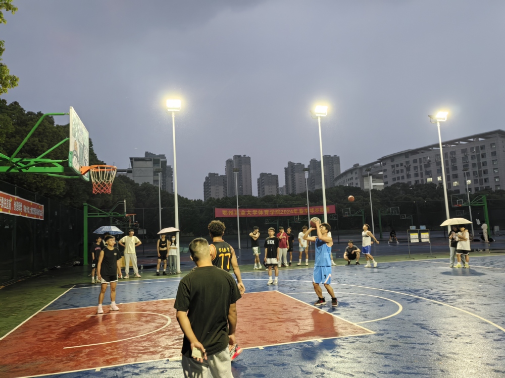 5月21日的决赛当晚,室外体育综合实训中心灯光篮球场气氛热烈,来自各院部的13支代表队在啦啦队的加油呐喊声中,依次在不同分值的1分点位、2分点位和3分点位进行定点投篮,伴随着队员的每一次投篮出手,鼓掌声和叹息声此起彼伏。连雨点都被球场上的氛围吸引,从天上跑下来参与到比赛之中。