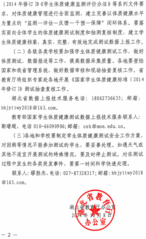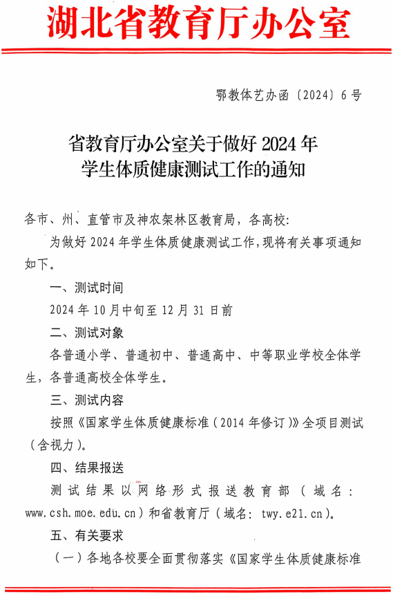 湖北省教育厅办公室关于做好2024年学生体质健康测试工作的通知