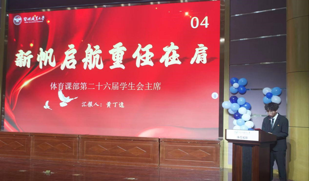 新帆启航,重任在肩。第二十六届学生会主席黄丁逸登台发言,他表达了对学生会工作的热忱与担当,阐述了未来的工作规划与目标,表示将带领新一届学生会成员凝心聚力、务实创新,推动体育课部学生工作再上新台阶。