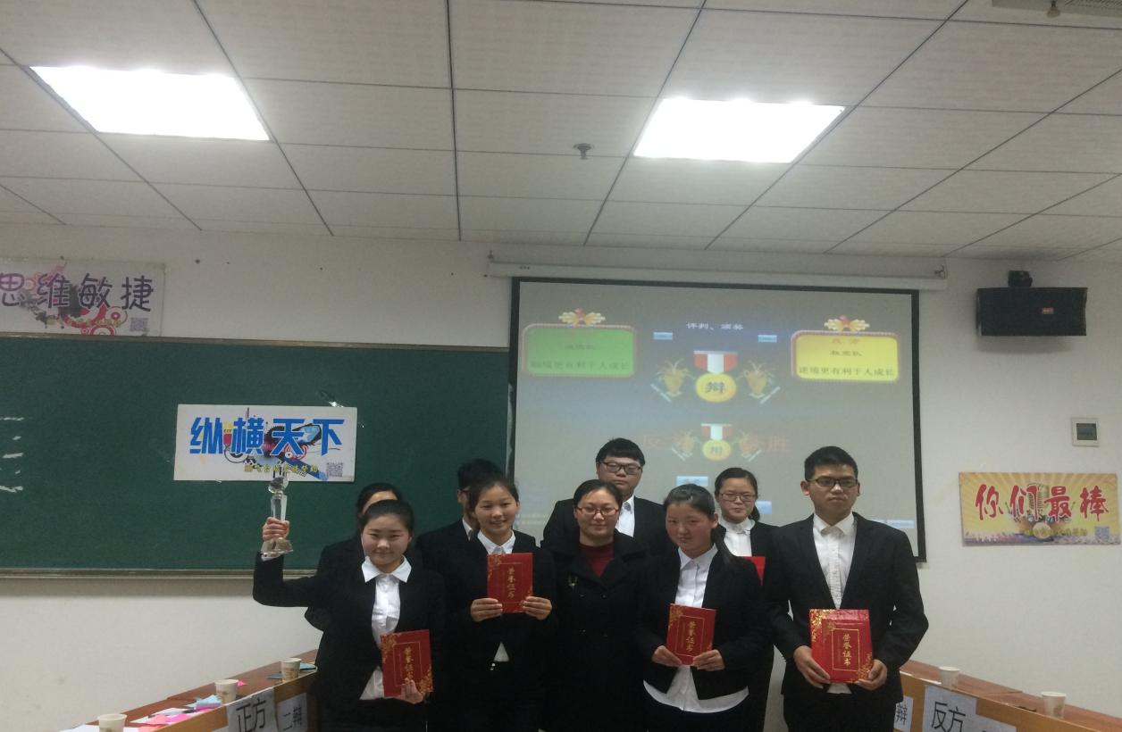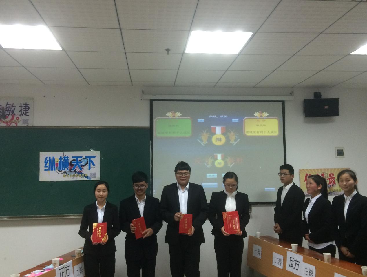 本次辩论赛正方“说德队”和反方“权兜队”分别以“顺境更有利于人的成长”和“逆境更有利于人的成长”的观点进行了激烈的辩论,双方辩手唇枪舌战、你来我往,纷纷对辩题提出自己的观点,不时提出独到观点,观众提问环节交战更是激烈异常,反方队伍的问题简洁明了,直刺反方要害,为反方队伍加分不少。点评环节于友华学长幽默风趣的语言使各位辩手以及现场观众受益匪浅。反方得体的服装、标准的普通话、极强的随机应变能力赢得观众和评委的一致好评,一举拿下冠军的宝座。最后,教育与管理学院团总支书记吕婷为各位选手颁奖并合影留念,精彩瞬间在这一刻定格,这场极具意义的辩论赛也就此落下了帷幕。
