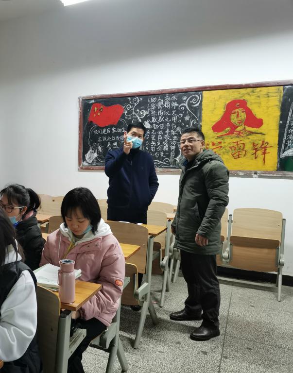 马凌军等一行一早来到学院教学楼前,迎接新学期返校上课的师生;随后走入504教室,与同学们一起认真聆听肖开勇副教授的讲课,并在课后与任课教师进行了深入交流,对教师课堂教学提出了改进建议。