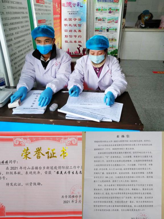 (胡钰清供稿)2020年寒假期间,教育与管理学院小学教育15班的潘婷婷积极响应号召,放弃与家人“宅”在家的机会,主动请缨,积极参与支援家乡疫情防控工作,因工作积极主动,成绩突出,被志愿服务地共青团竹山县楼台乡委员会授予“最美大学生志愿者”称号。