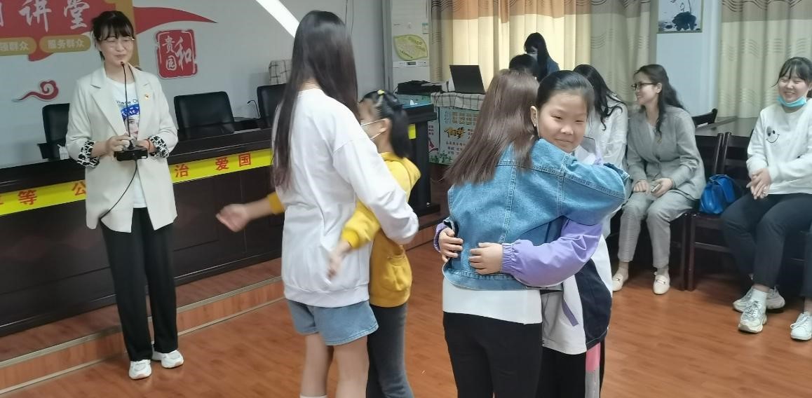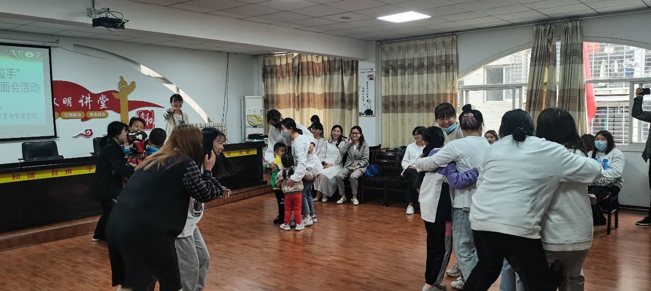 紧接着开展了与小朋友的游戏互动,学生与小朋友们手拉手转圈圈,开始了“天上的星星抱娃娃”游戏,现场气氛热情高涨,一片欢声笑语。