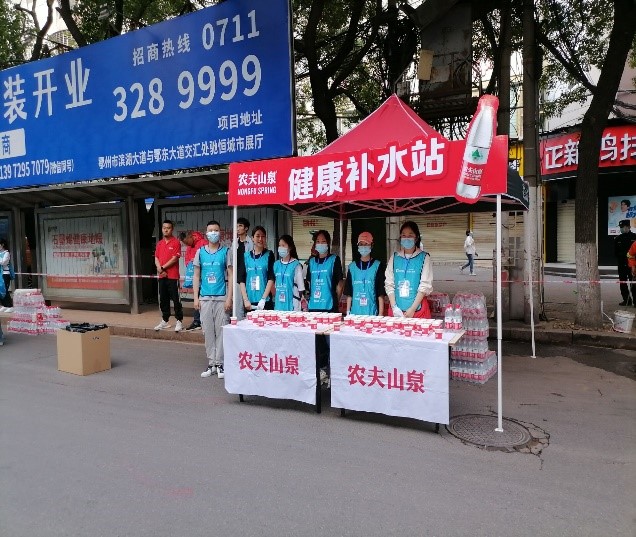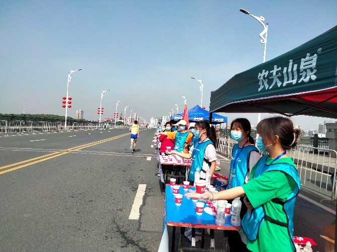 随着参赛选手踏上赛道,各岗位的志愿者也迅速进入工作状态。大家在各个岗位尽职尽责,合作完成递水、供应海绵块和食物水果服务。在后续阶段,陆陆续续有大批运动员们跑到了饮水食物等站点,现场开始变得繁忙起来。但是志愿者们依然临危不乱,沉着面对各种繁杂的场面,拧瓶盖、倒水、递水、浇海绵、洗食物等各项工作都井然有序进行着。