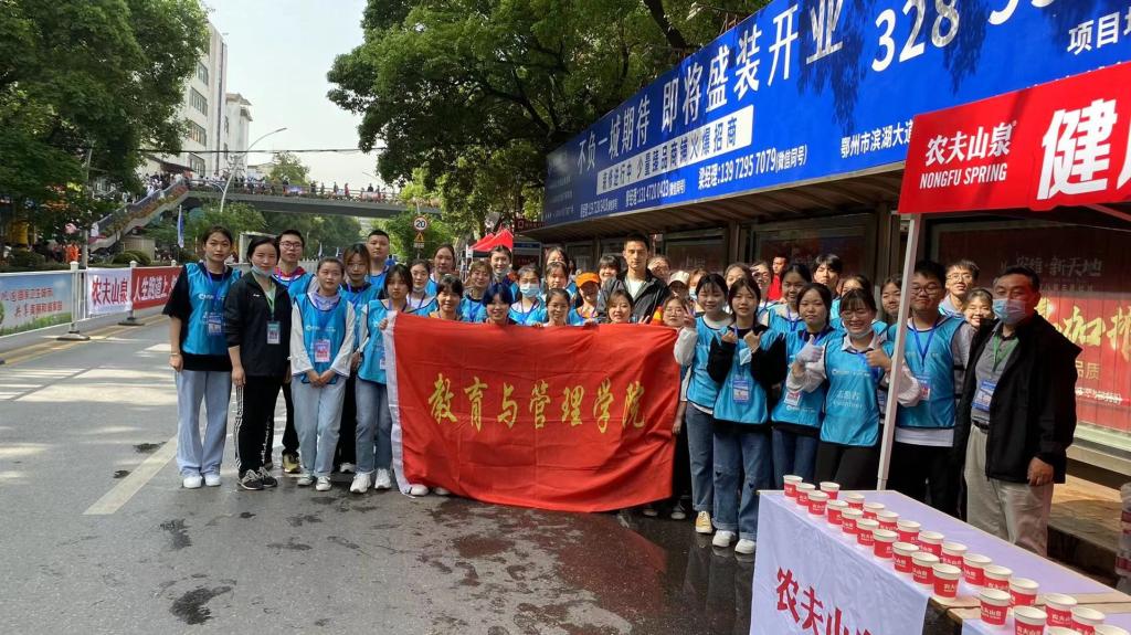 2021年5月5日上午,2021湖北·长江超级半程马拉松暨鄂州半程马拉松赛在鄂州市凤凰广场举行。教育与管理学院志愿者队190名学生积极参与到赛事志愿服务工作中。