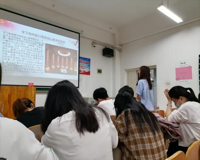 随后,各班的主持人用无数共产党人的先进事迹为同学们生动阐述了党的初心和使命。虽不能与前辈们面对面交流,但一件件富有“生命力”的鲜活史实让我辈有幸与革命前辈拥有了“穿越时空的对话”。在这期间,现场氛围十分活跃,同学们积极举手提问,并发表自己感想。