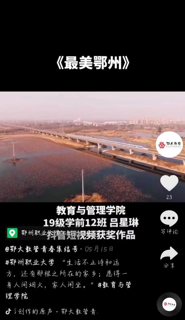 【陶依然 黄建章供稿】为纪念五四青年节,继承和发扬“五四”爱国精神以及进一步引导广大青年为家乡、为学校代言,表达对家乡的思念、对母校的热爱之情,教育与管理学院面向全体学生开展“最美家乡/校园”抖音短视频征集大赛。