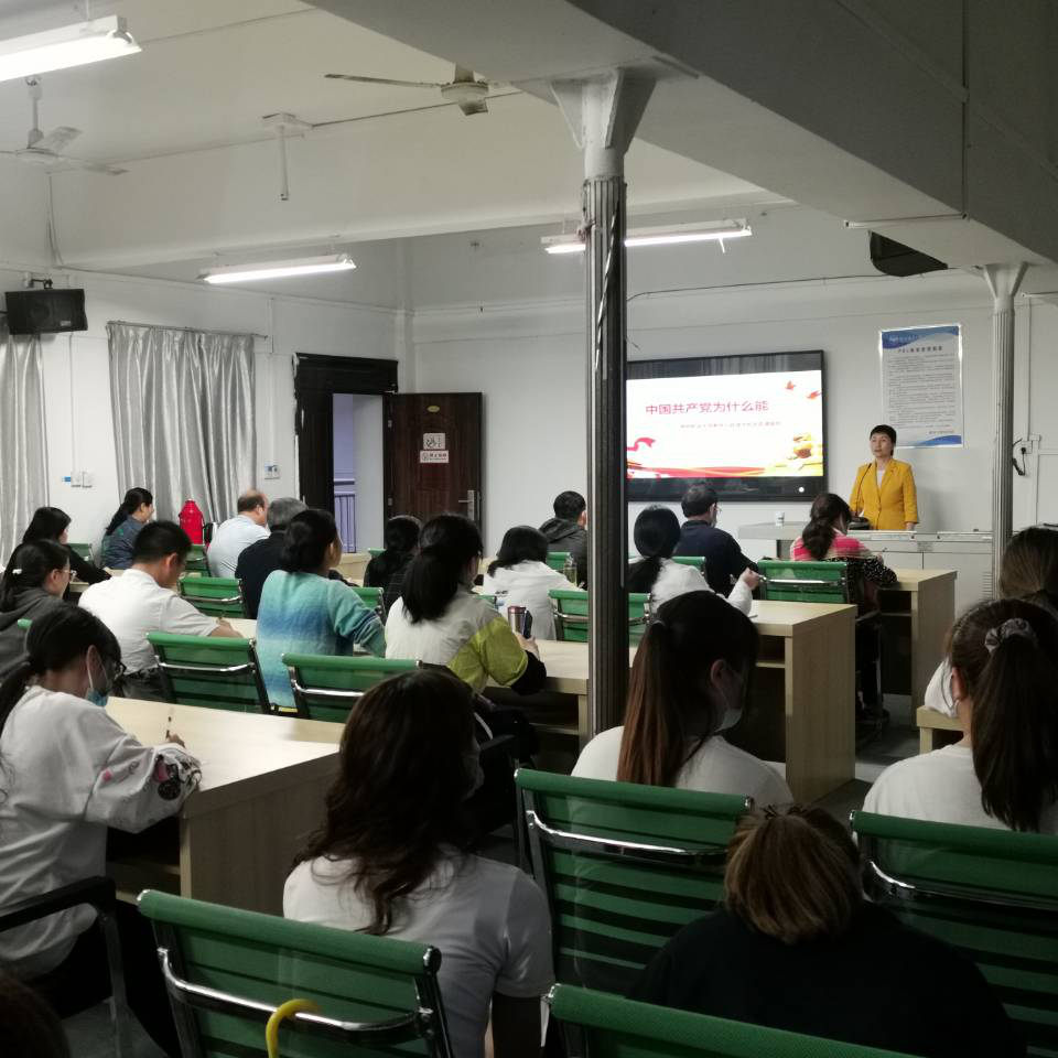 周书记围绕“中国共产党成立的背景、中国共产党在不同历史时期“能”在哪里、中国共产党“能”的根本原因、寄语党员教师和青年大学生”四个方面进行了深入细致地阐述。她强调中国共产党带领中国人民从站起来到富起来再到强起来是近代以来无数仁人志士不懈探索的结果,是中国共产党人顺应世界历史发展潮流的结果,是中国共产党人领导人民不懈奋斗的结果。全球新冠疫情是一次大考,相对于西方国家的开卷考试,中国在这场闭卷考试中交出了一份优秀的答卷,这离不开党的领导,更离不开党组织的引领力、组织力和凝聚力。周岫书记表示,身为党员,应有担当意识,全体党员应牢记:危难之中,党员先行。