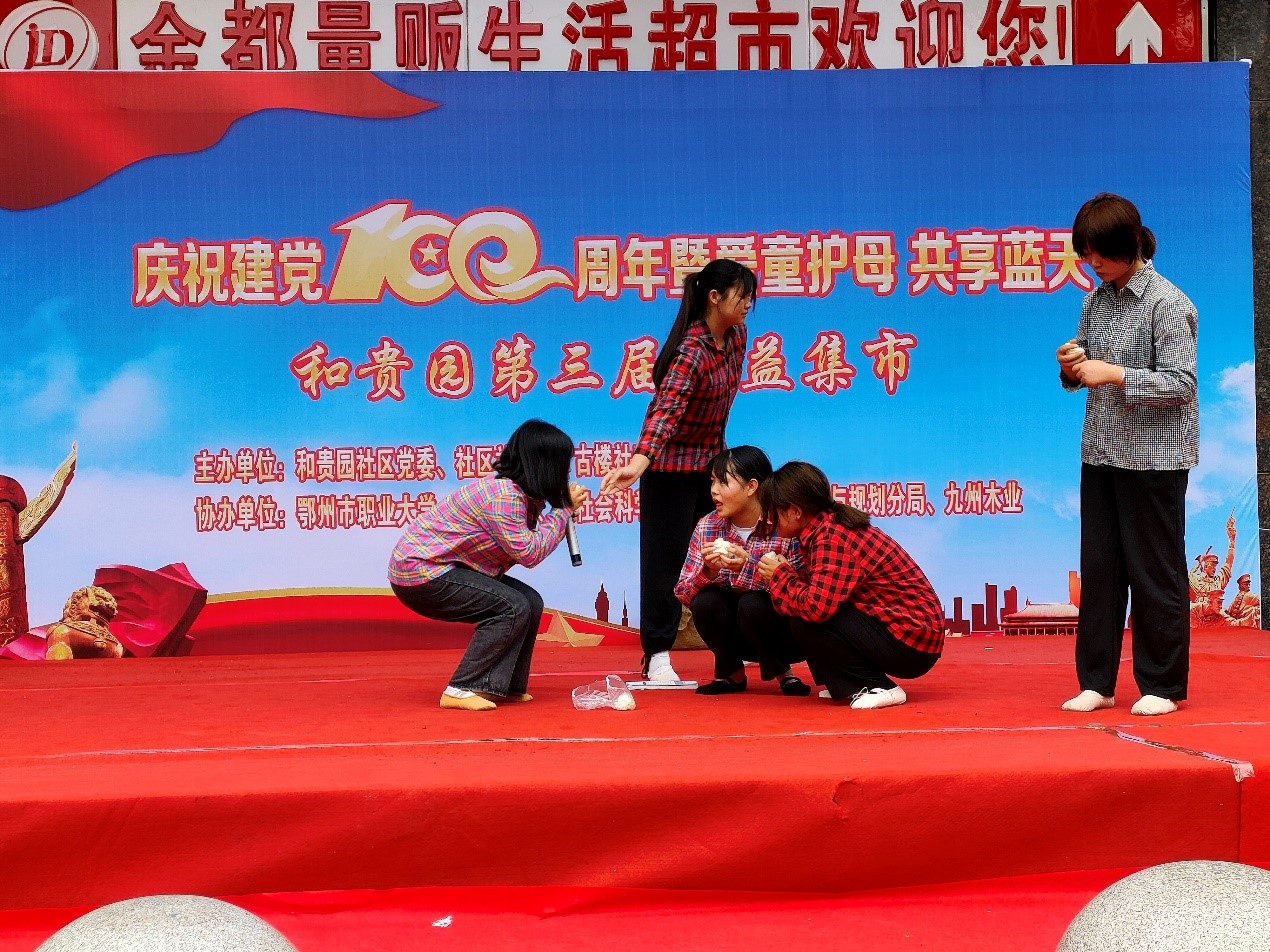 【20级小教二班赵艺供稿】为庆祝建党一百周年,弘扬中华民族团结互助的优良传统,体现公益事业扶贫救困的宗旨,实现“共融、互助、关爱”的温暖型社区,2021年6月17日上午和贵园社区联合鄂州职业大学、鄂州市社会科学界联合会、鄂州市商务局等单位举办“庆祝建党100周年—暨爱童护母 共享蓝天”公益集市活动。