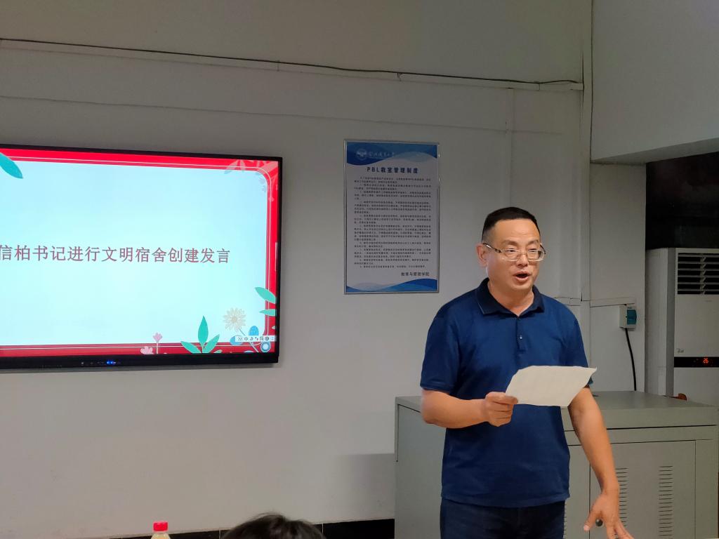 我院党总支副书记瞿信柏对获奖宿舍同学表示祝贺,并阐释了文明宿舍创建的目的和意义,对文明宿舍未来的发展提出期望。此外,还强调当代大学生应该重视“自我教育,自我管理”,营造舒适的学习生活氛围,打造优美的校园环境,致力于提高校园整体文明程度,建设绿色、和谐、美丽的校园。