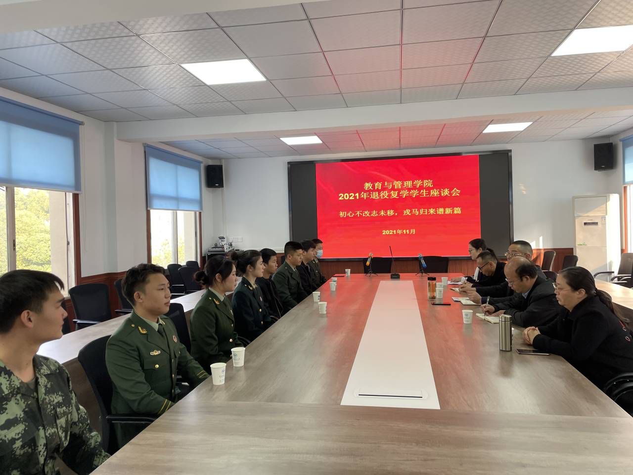 (谢品、刘莹莹供稿)为进一步做好我院退役复学大学生服务工作,弘扬拥军优属优良传统,营造爱军拥军、尊崇军人的浓厚氛围,激发广大学生参军报国的热情,2021年11月18日下午,我院在二号楼315会议室召开了退役复学学生座谈会。学院院长陈适,党总支副书记瞿信柏、万海访,团总支书记吕婷,学院征兵工作负责人谢品参加了此次座谈会。