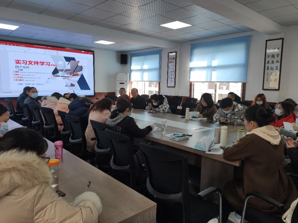 会上,副院长肖开勇带领大家共同学习《教育部等八部门关于印发职业学校学生实习管理规定的通知》(教职成【2021】4号)、《职业学校学生实习管理规定(2022版)》、《新实习管理规定——答记者问》、《职业学校学生岗位实习三方协议(示范文本)》等文件精神。现场各位老师认真听取报告,并做好笔记。