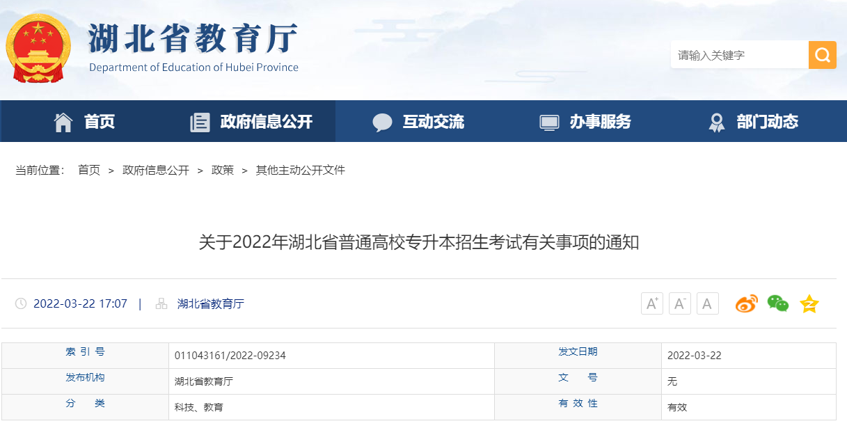 根据《教育部办公厅关于做好2022年普通高等学校专升本考试招生工作的通知》(教学厅〔2021〕8号)、《省教育厅关于做好2022年湖北省普通高等学校专升本工作的通知》(鄂教高函〔2022〕5号)精神,现就2022年我省普通高校专升本招生考试工作有关事项通知如下: