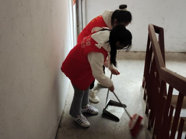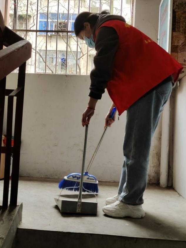 身穿红色志愿服、手拿卫生工具,每位志愿者们认真清扫楼道垃圾。整个社区只留下沙沙的劳动声音,同时留下的还有一道道亮丽的风景。