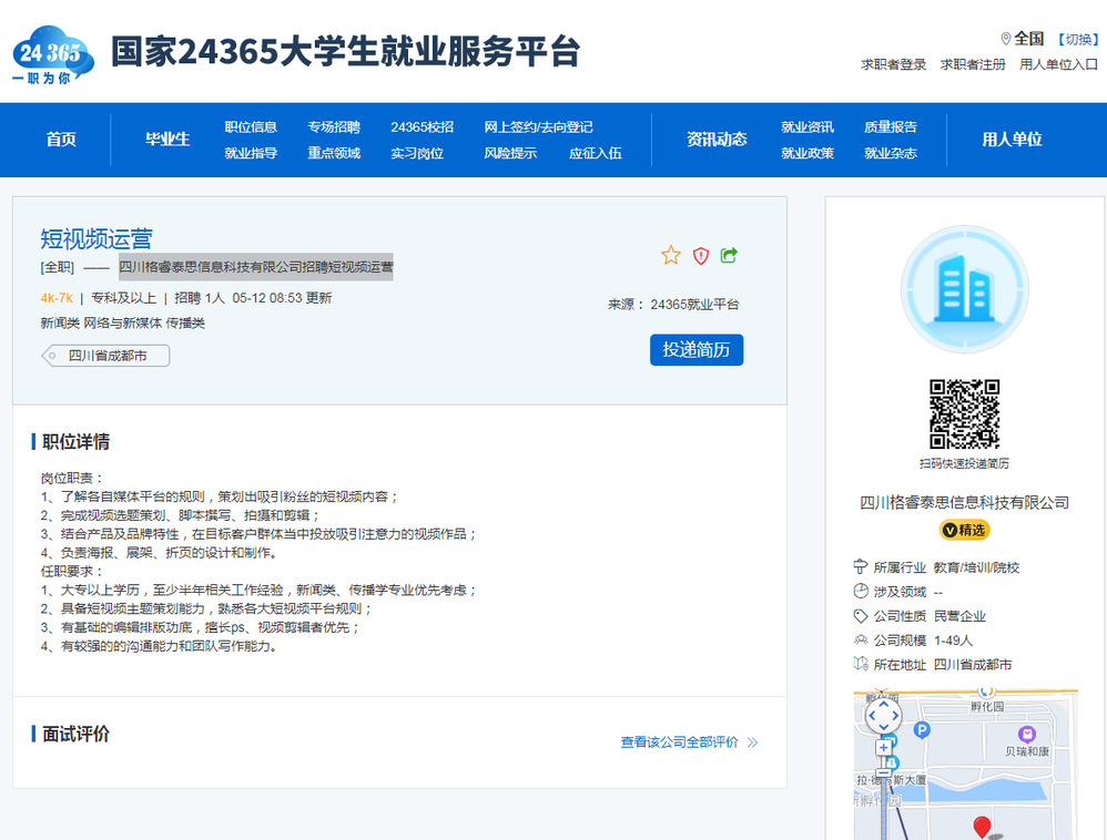 【招聘】四川格睿泰思信息科技有限公司招聘短视频运营