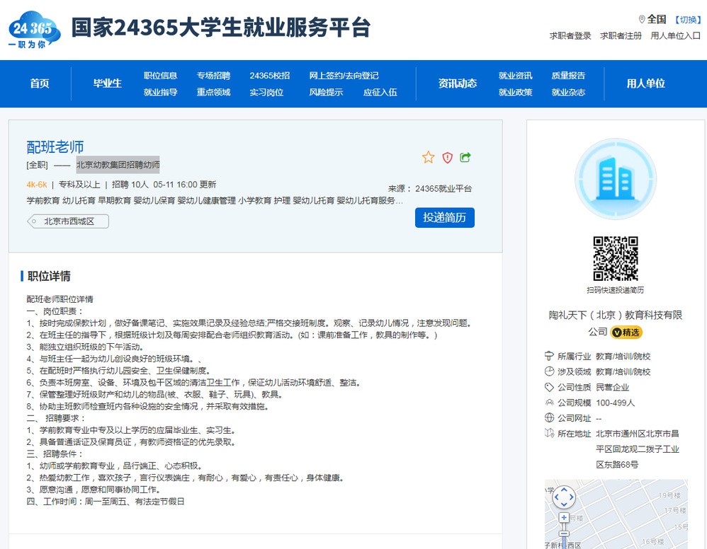 【招聘】北京幼教集团招聘配班教师