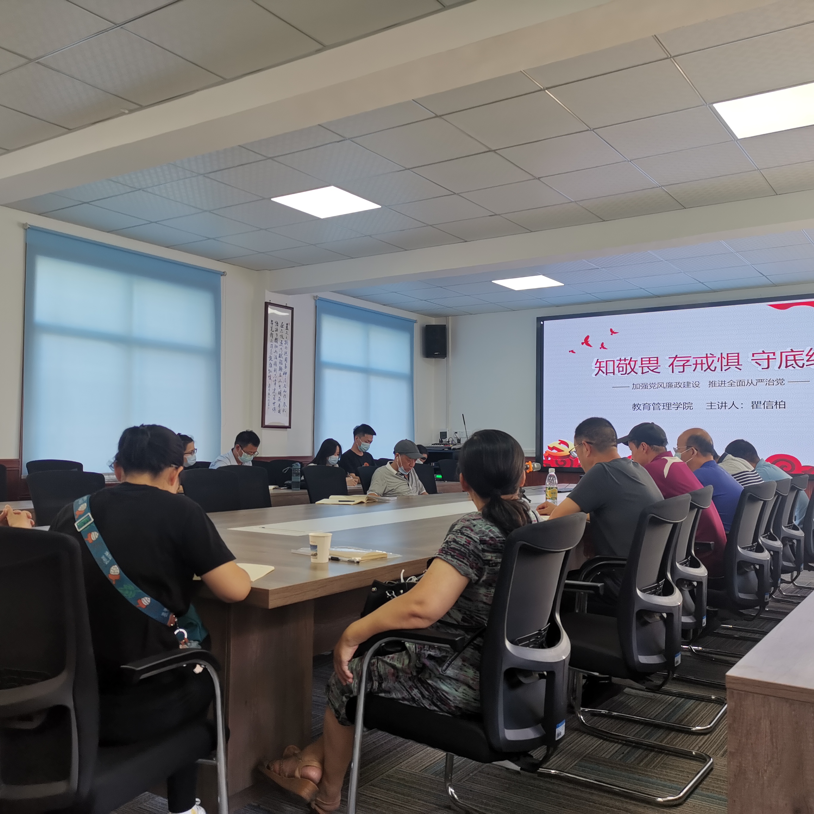 廉政党课上,教育管理学院瞿信柏书记从回顾我国反腐败和廉政建设之路、学习《中国共产党廉洁自律准则》、学习《中国共产党纪律处分条例》三个方面展开讲解。瞿信柏书记强调作为师者,作为人类灵魂的工程师,更要“忠诚可靠、服务人民”。始终以党和国家工作大局为重,做到廉洁自律,始终以更高的标准、更严的纪律要求自己,时刻牢记党的宗旨和使命,着力弘扬新风正气,自觉抵制歪风邪气,夙夜在公、廉洁自律,始终保持共产党人的蓬勃朝气、昂扬锐气和浩然正气,做到堂堂正正做人,干干净净做事,真正在思想上、政治上、行动上保持共产党人的革命定力。