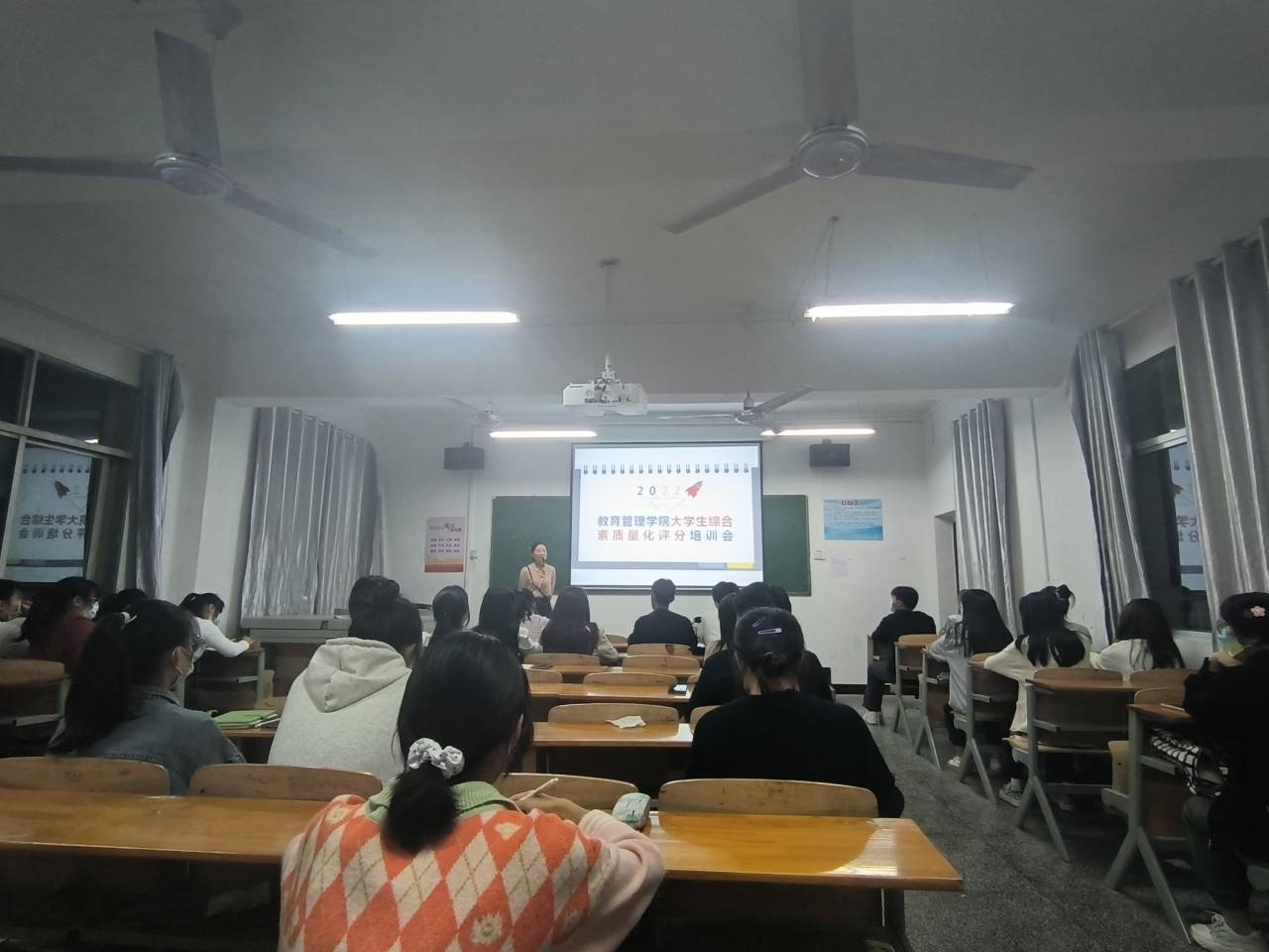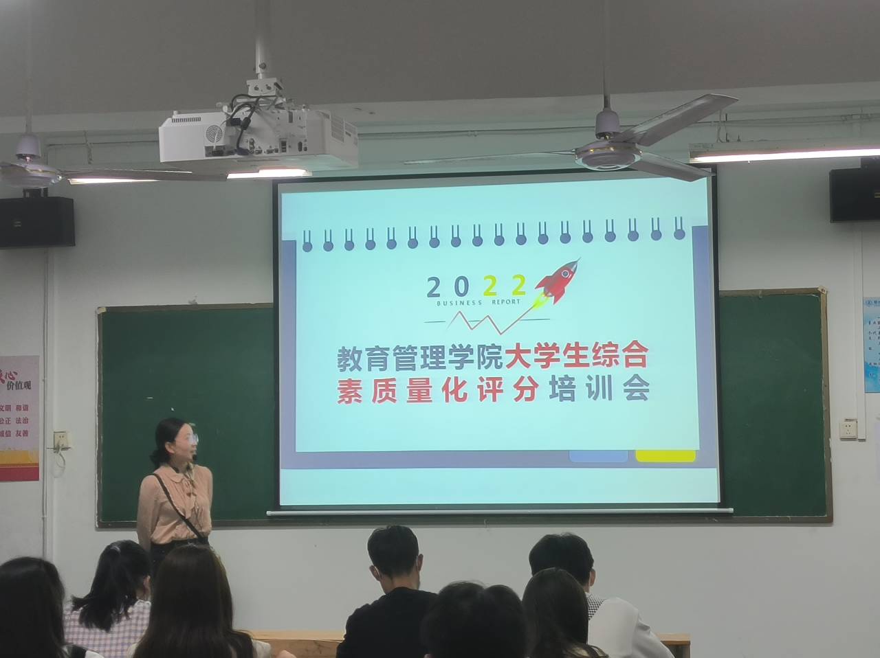 (供稿人 夏子宜)为推动量化管理在我院学生德育管理工作中的实践运用,抓住新生刚入学的关键期,帮助学生形成良好的行为习惯,提高思想道德水平,10月15日晚,教育管理学院在2号楼205教室开展“大学生综合素质量化评分”培训。本次培训由夏子宜老师主讲,22级全体班长参加。