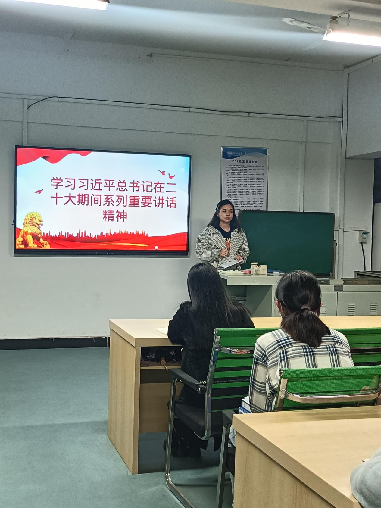 此后,由学生党员谭显丽同志分享学习党的二十大报告的心得:“身为学生党员,应当身先士卒,高举中国特色社会主义伟大旗帜,全面贯彻习近平新时代中国特色社会主义思想,弘扬伟大建党精神,自信自强、守正创新,踔厉奋发、勇毅前行,为全面建设社会主义现代化国家、全面推进中华民族伟大复兴而团结奋斗。”