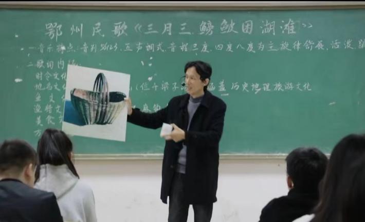 在民歌课堂上,我校教育管理学院副教授张靖鸣解读鄂州民歌《三月三,鳑鲏困湖滩》,这是一首季节性风俗民歌,曲调优美,歌词内蕴丰富,涵盖了时令文化、地名文化、历史文化、鱼文化 、渔猎文化、旅游文化、美食文化等特征。民歌是老祖宗留下的珍贵文化遗产,但目前已濒临消失境地,所以传承工作势在必行,意义重大。