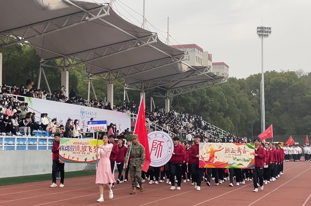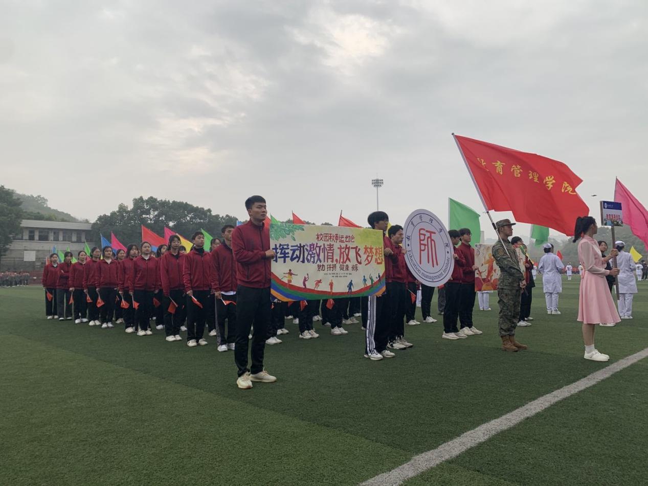 随后进行运动员方阵入场式,首先入场的方阵是国旗方阵,紧接着是鲜花方阵和各个学院、课部等方阵队伍井然有序地通过主席台。当教育管理学院方阵迈着铿锵有力的步伐,呼喊着响彻云霄的口号,昂首阔步上场,现场的气氛达到了高潮。他们身着红色上衣,如同冉冉升起的火炬,是光和热的象征,他们传承着教管红色精神,谨记良师的谆谆教导,时刻准备着为祖国的教育事业贡献力量。这只年轻的队伍勤奋好学,永不言弃,志存高远气冲云霄,壮志凌云响彻九天,他们自信地接受主席台领导的检阅,是鲜衣怒马少年时最好的写照。