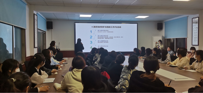 培训会上,团总支副书记丁格格就各班团干进一步系统学习共青团的基本理论和基本知识、加深对共青团的认识和了解、清楚团员的义务和权利这三大板块进行了详细的指导讲解。 随后,丁副书记围绕着“团员如何参与团建工作与活动”这一主题和各班团干展开了激烈的探讨。大会中,丁副书记耐心解答每一位班级团干的问题,使各班团干更深入地了解参与共青团组织性活动、成长性活动、奉献性活动及政治性活动四大工作与活动的要求与细则,还通过举案例的方式形象具体地向各班团干展示出共青团工作与活动要做什么,该怎么做,做了要注意什么等事项。