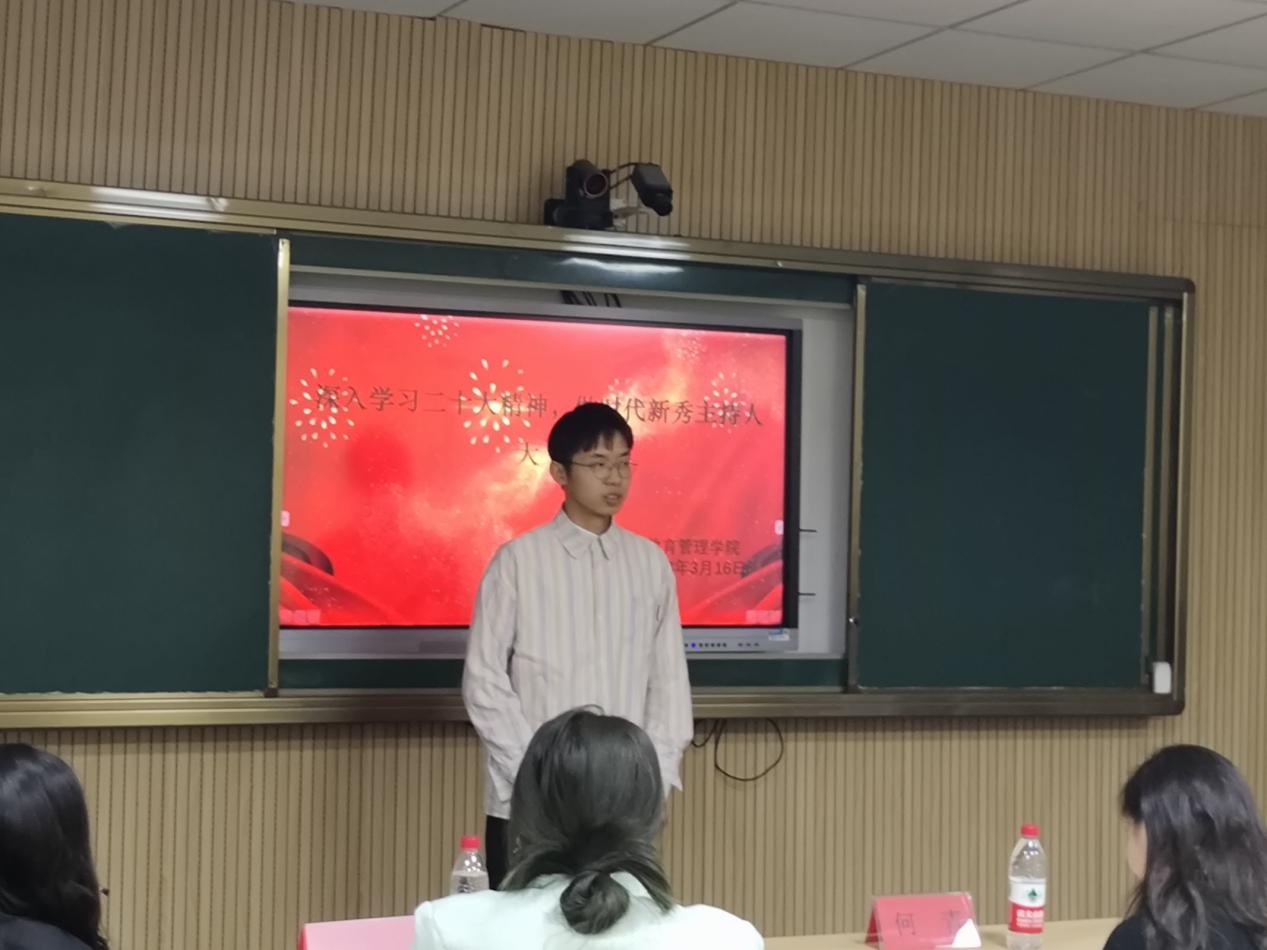 (供稿人:何青 莫海鹏)为了进一步提高学生语言表达能力,丰富校园文化生活,彰显校园文明风貌,为学院广大优秀主持人才提供展示自己的舞台。316日晚19时,教育管理学院学生党支部、团总支学生会二号楼403会议室举行“深入学习二十大精神,做时代新秀主持人”挑战主持人决赛,本次大赛共有39名同学参加,经过筛选,19名选手竞级决赛。