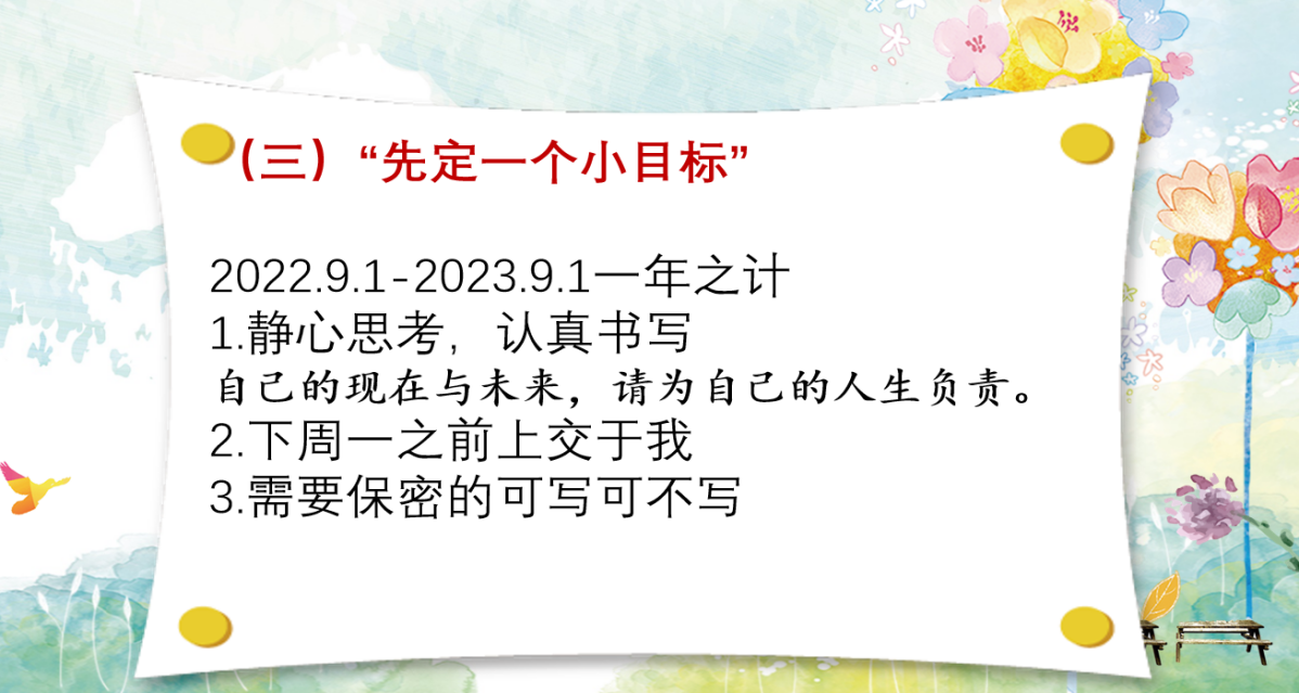 本案例针对的是教育管理学院22级小学教育专业的学生,该群体普遍具有以下特点:一是对未来发展缺乏合理的规划和目标。尤其是初进大学校园的新生,对大学生活如何度过,缺乏清晰的目标和规划。二是自我管理和主动学习的能力较差。相比于中学生活,大学生活有了更大的自由度,而该群体学生自我约束和主动学习的能力不强,均有待提高。三是缺乏自信,人际交往能力和表达能力较弱。多数学生会将自己定位为“社恐”,害怕在公众面前表达自己;且人际交往的圈子较小,缺乏自信。针对以上学情打造班级文化建设,以期提高学生的自我管理能力、主动学习能力和人际交往能力,提升自信,帮助他们更好地树立人生目标。