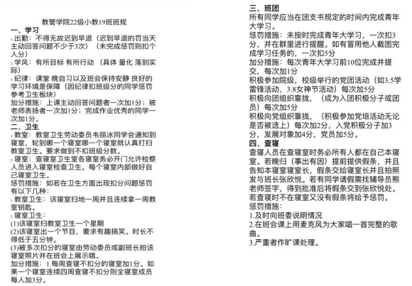 根据学院对班级考核的内容,班规从学习、卫生、班团和查寝等四大方面明确规定了行为规范和奖惩措施。