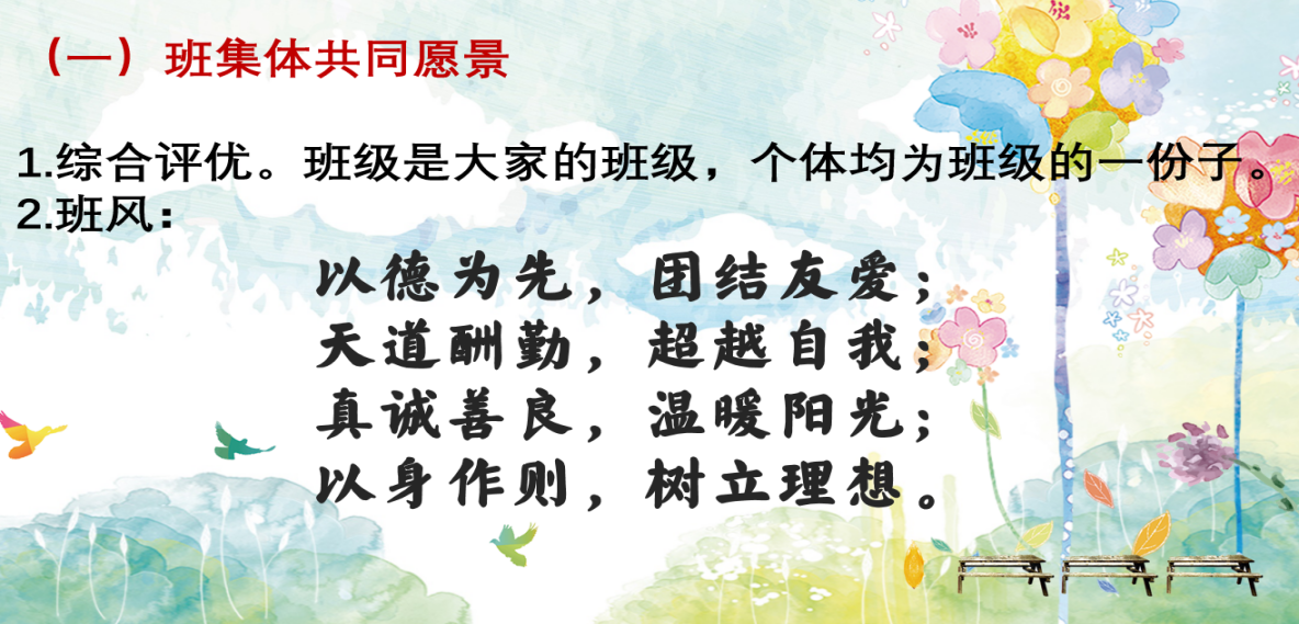 班风是班级多数成员的思想认识、情感意志和精神状态的综合反映,是班级文化建设的核心和精髓所在。优良班风对全体学生起着熏陶与感染的作用,是一种重要的教育力量。因此,在建班之初便确立班集体共同愿景即班风,有着重要的导向作用。经过师生共同探讨,两个班最终确立了“以德为先,团结友爱;天道酬勤,超越自我;真诚善良,温暖阳光;以身作则,树立理想。”的班风班训。