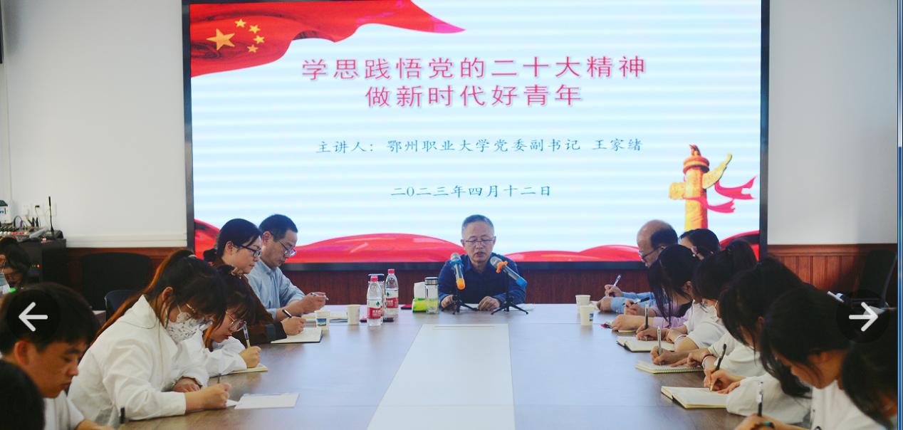 (供稿人:何青、黄怡婷、王英鉴)为深入学习宣传贯彻党的二十大精神,感受思想伟力、吃透精神实质,把握核心要义,激励师生踔厉奋发、勇毅前行。4月12日下午,鄂州职业大学党委副书记、副校长王家绪以《学思践悟党的二十大精神、做新时代好青年》为题,为我院师生上了一堂生动的思政课,学院党政班子成员及23年春季40余名学生党员发展对象共同聆听了本次思政课。