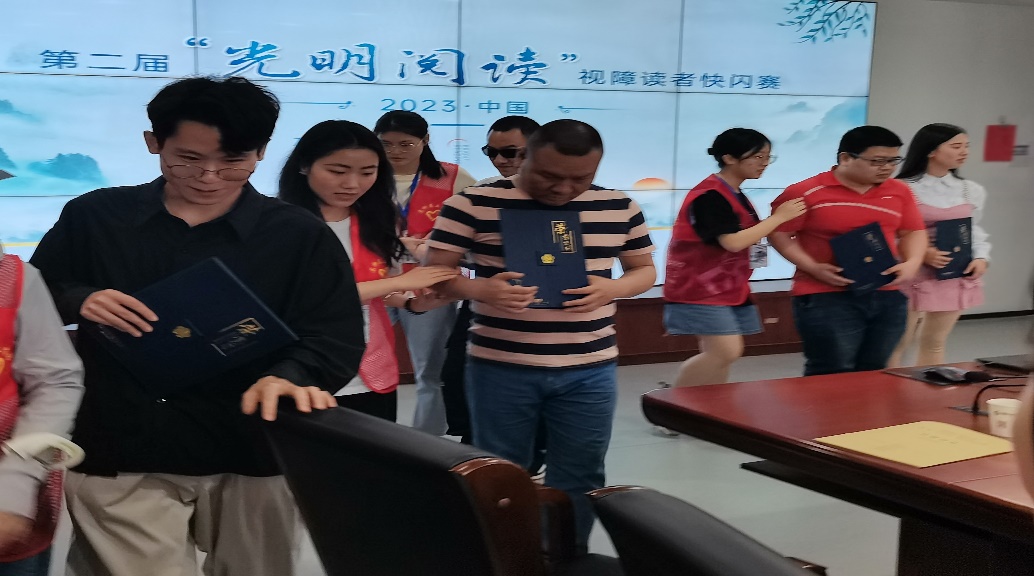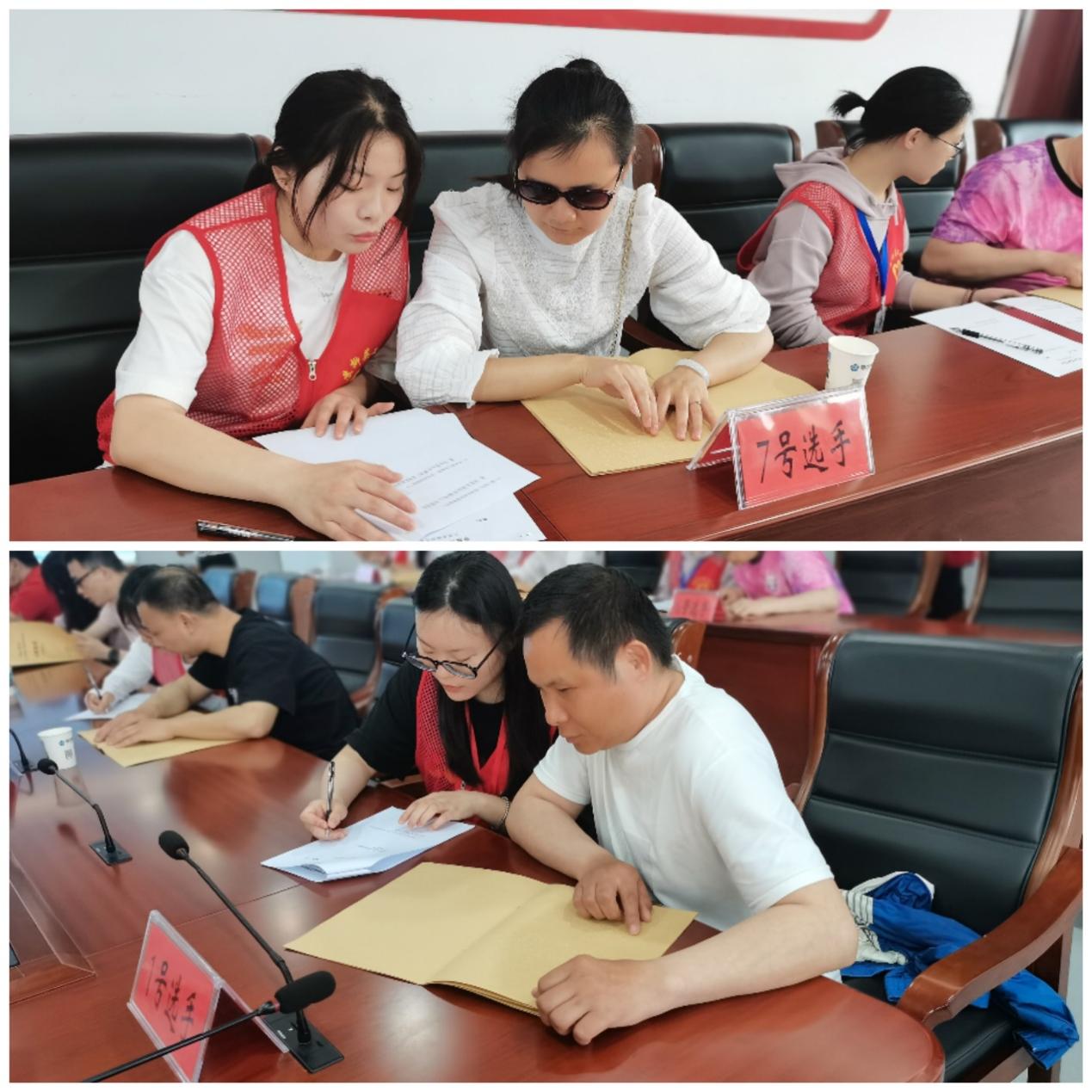 进入赛场后,志愿者搀扶着选手们在工作人员的指示下按照秩序落座,随后工作人员为选手们分发了盲文试卷、为志愿者们放置答题卡。比赛的第一项是盲文摸读,选手们在主持人的开始指令下,迅速的触摸盲文试题并且及时地将答案传达给相应的志愿者做记录,赛场里竞争激烈的比赛就此拉开帷幕,选手们与志愿者也配合得相当默契。第二项是音频听读,工作人员播放介绍“汉绣”的音频,在比赛过程中志愿者们与选手们共同领会中华文化的源远流长,体悟汉绣的文化魅力。第三项是无障碍观影抢答,工作人员播放视频,设置问题。选手们细心聆听影视内容,触摸盲文试题,积极举手抢答,志愿者们进行协助。现场比赛氛围紧张而激烈,选手们与志愿者们积极踊跃的参与并享受着精彩的比赛过程