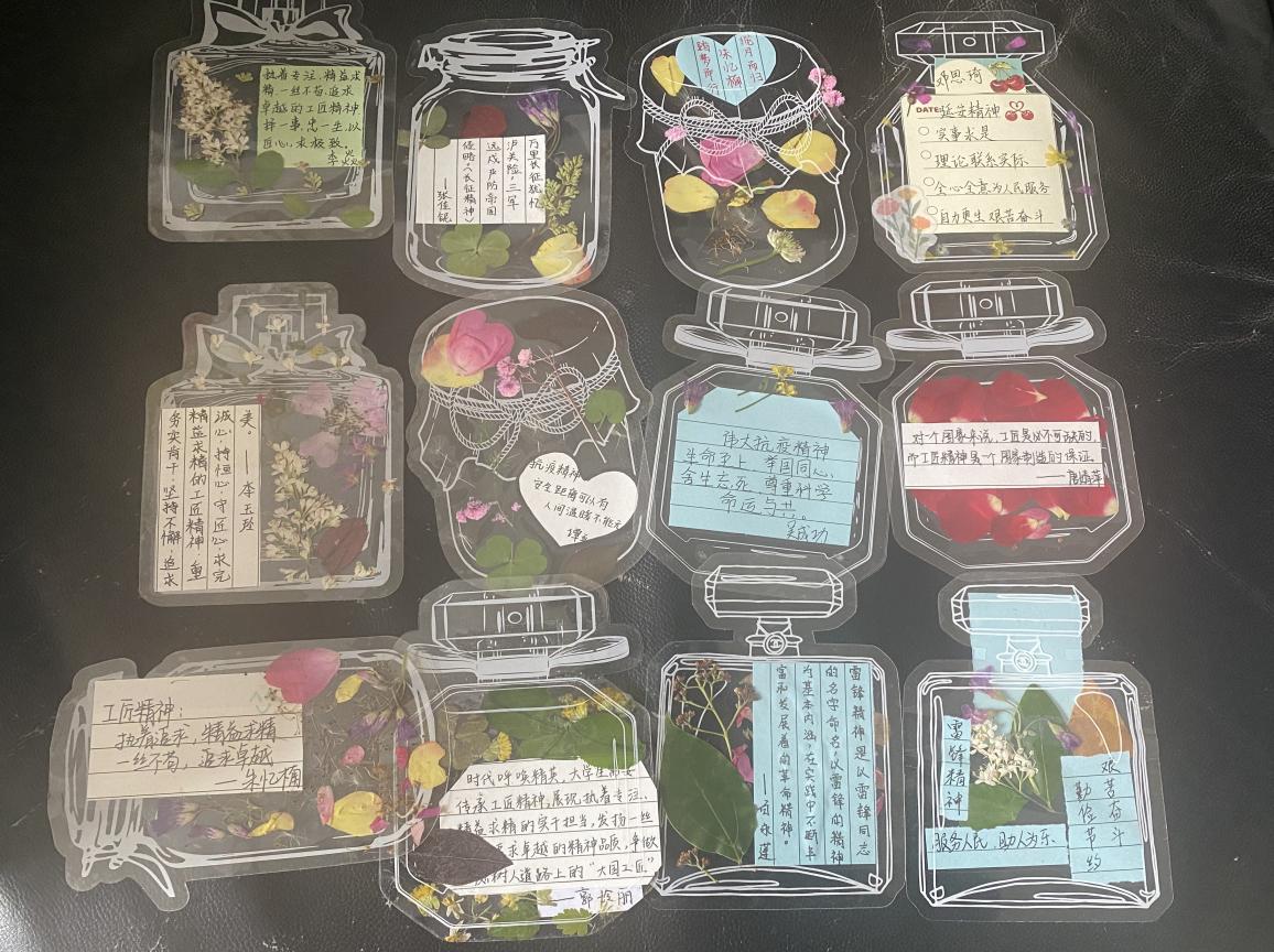 最后,主持人给每位活动参与者分发了文创道具,要求他们依据学生社区内文化墙的内容------“中国共产党的伟大精神谱系”,选取一个知识点,结合自身学习情况进行图文制作,完成文创作品。在实践中,领悟我党伟大精神的内涵,增强党性修养,走好时代的新征程。