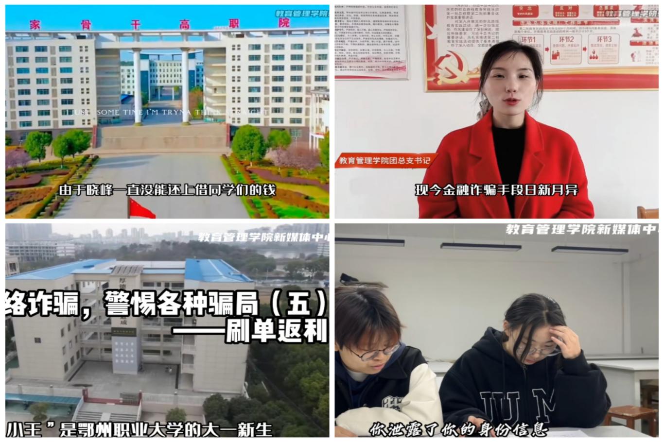 (供稿人:何青 王英鉴)近年来不法分子利用日益发展的通信技术和快捷支付技术在非接触状态下,设计花样繁多的骗局实施电信网络诈骗。为了提高学生的反诈意识,共同构建反诈校园,鄂州职业大学教育管理学院学生党支部新媒体工作室策划拍摄了系列《揭秘网络诈骗,警惕各种骗局》主题微电影。镜头前,教育管理学院的学生们脑洞大开、自导自演,以巧妙的构思、风趣的语言、夸张的肢体语言“还原”诈骗套路,让观众在欢笑之余也学习了反诈知识。
